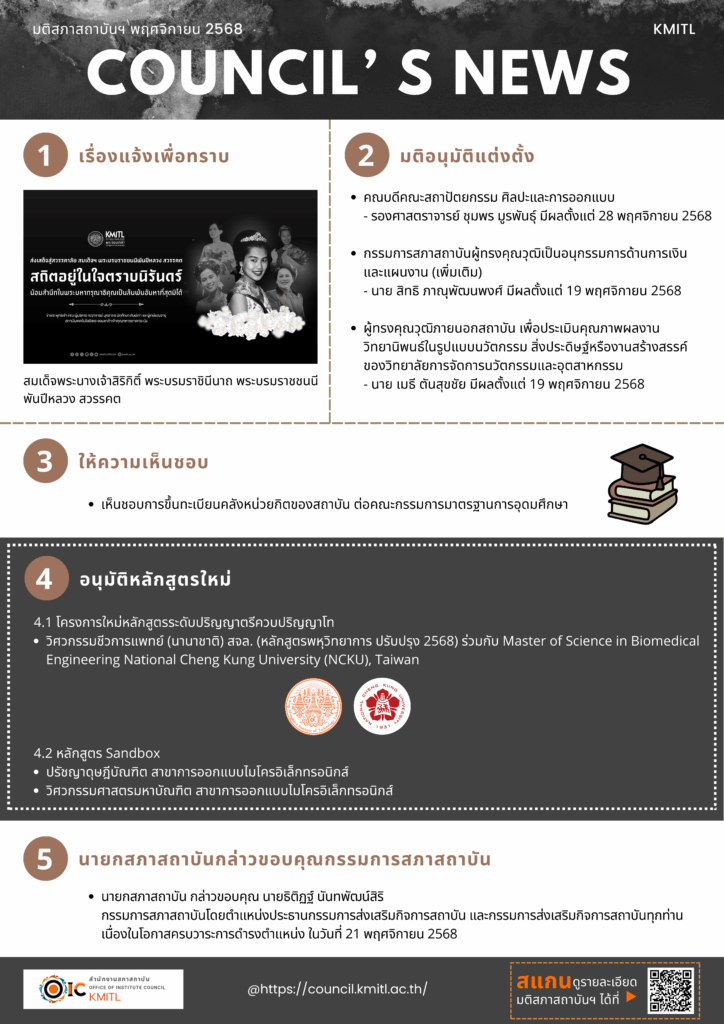 KMITL COUNCIL’s NEWs-November-2025By manao.bu / November 25, 2025 สรุปมติสภาสถาบัน ครั้งที่ 11/2568 เมื่อวันที่ 18 พฤศจิกายน 2568